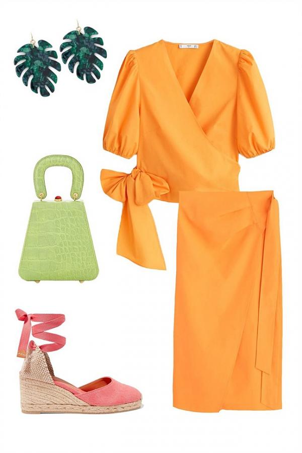 Tại buổi tiệc cưới tổ chức ở sân vườn, hãy mix các màu sắc theo hướng tương phản như vậy bức ảnh kỷ niệm của bạn sẽ trong dịp này sẽ tuyệt vời hơn. Gợi ý cho bạn là một bộ đầm màu cam, đi cùng túi x.á.ch màu xanh lá cây, giày đế xuồng màu hồng và hoa tai bản lớn có màu xanh biển.