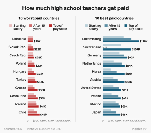 Bộ dữ liệu đầy đủ của OECD cho thấy khoảng cách lớn giữa GV lương cao và lương thấp trên thế giới. Khi được đổi sang đồng USD, nhiều mức lương không thua gì ở Mỹ, trong khi có những nơi lại kém xa. Để so sánh, mức lương khởi điểm cho một GV trung học không có kinh nghiệm ở Luxembourg khoảng 70.000 USD và lương cao nhất cho một GV có thâm niên là 124.000 USD/năm.