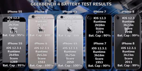 Bên cạnh đó, bài test của Geekbench ghi nhận các mẫu iPhone 5s, iPhone 6 và iPhone 7 đạt thời lượng pin lần lượt là 2 giờ 35 phút, 2 giờ 34 phút và 2 giờ 58 phút khi chạy iOS 12.3. Sau khi nâng cấp, iPhone 5s kéo dài thêm 14 phút lên mức 2 giờ 49 phút. Còn iPhone 6 và iPhone 8 có thời lượng pin tăng thêm 18 phút.