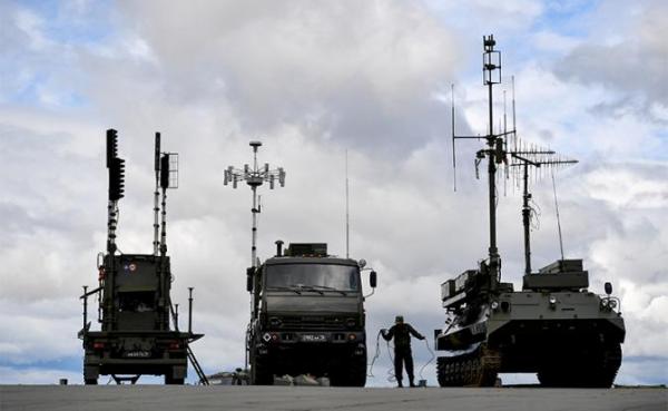 Tổ hợp tác chiến điện t..ử: trạm phát nhiễu R-330 Z “Zitel” (Р-330Ж "Житель ") và tổ hợp tác chiến điện t..ử RB-301B “Borisoglebsk-2” (РБ-301Б "Борисоглебск-2") (từ trái sang phải) (Ảnh: Donat Sorokin/ТАSS)
