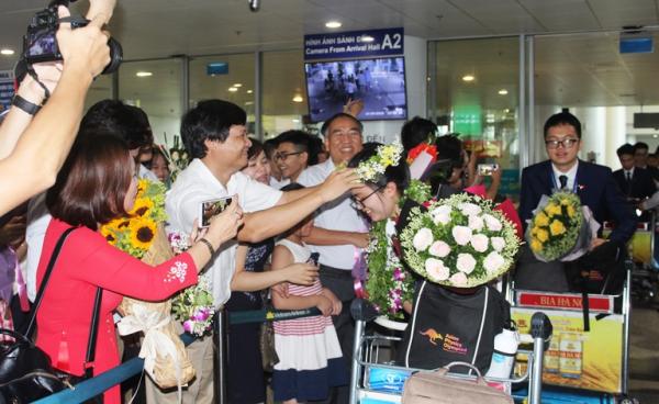 Chiều 14/5, sau khi vừa bước xuống sân bay Nội Bài, em Nguyễn Khánh Linh đã được thầy cô và bạn bè, cùng người thân tặng hoa chào đón trong niềm vui sướng.