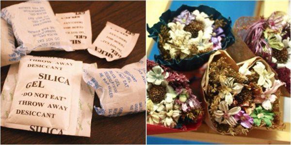 Bạn cho hoa và những gói hút ẩm vào túi nhựa để làm chậm quá trình phân huỷ hoa và giữ cho hoa được lâu hơn.