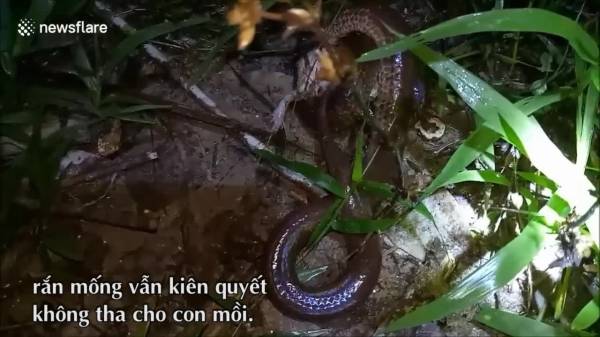 Mặc cho kích thước của ếch to gấp nhiều lần, rắn mống vẫn kiên quyết nuốt chửng con mồi. Sự việc diễn ra tại Nakhon Si Thammarat, Thái Lan.