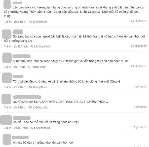 Trên trang facebook cá nhân, Hoàng Thùy - đại diện Việt Nam tham dự cuộc thi Miss Universe 2019 đăng tải thiết kế trang phục "Bàn thờ" kèm theo đó là dòng chú thích "dở khóc dở cười" : "Cho mình lên Hương sớm thế bạn gì ơi!" khiến fan tiếp tục tranh cãi. Không ít người bày tỏ ra không hài lòng với thiết kế được lấy ý tưởng từ tín ngưỡng thờ cúng tổ tiên này: "Nghĩ sao mà đưa bàn thờ làm trang phục truyền thống"; "Sự sáng tạo của con người đặc biệt là các nhà thiết kế thời trang là vô hạn, chỉ khi lên bàn thờ mới hết ý tưởng sáng tạo"; "Không hiểu sao có thể thiết kế ra trang phục như vậy"...