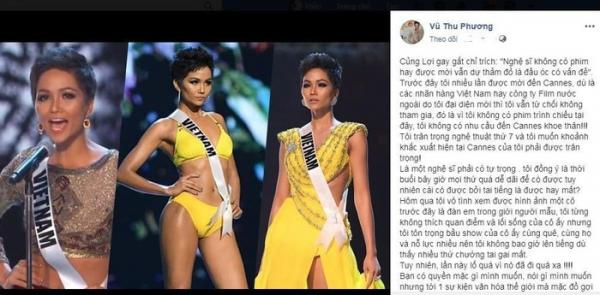 Mới đây, cựu người mẫu Vũ Thu Phương chia sẻ dòng trạng thái dài trên trang cá nhân. Cô chỉ trích gay gắt một chân dài Việt mặc khoe thân trên thảm đỏ Cannes.