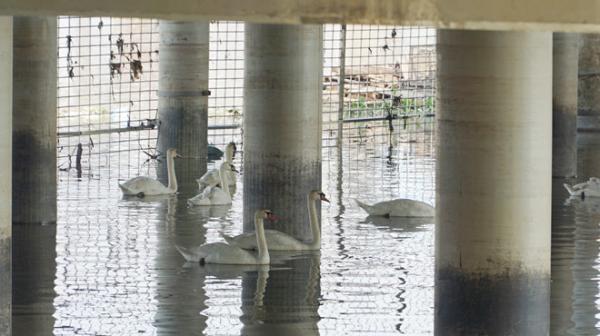 Những con thiên nga trắng có xuất xứ từ Hà Lan phải vào gầm cầm vượt sông Tam Bạc (Hải Phòng) tránh nắng nóng gay gắt với nhiệt độ lên tới 40 độ C.
