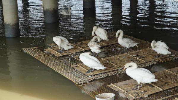 Bè gỗ dưới gầm cầu vượt sông Tam Bạc để thiên nga nghỉ ngơi, tránh trú mưa ảnh Lê Tân