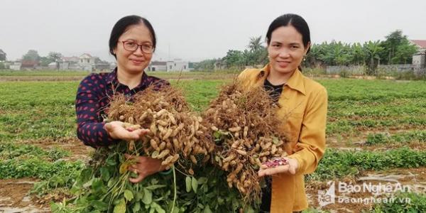 Nông dân Diễn Châu phấn khởi khi lần đầu tiên trồng lạc đỏ cho năng suất vượt trội. Ảnh: Mai Giang