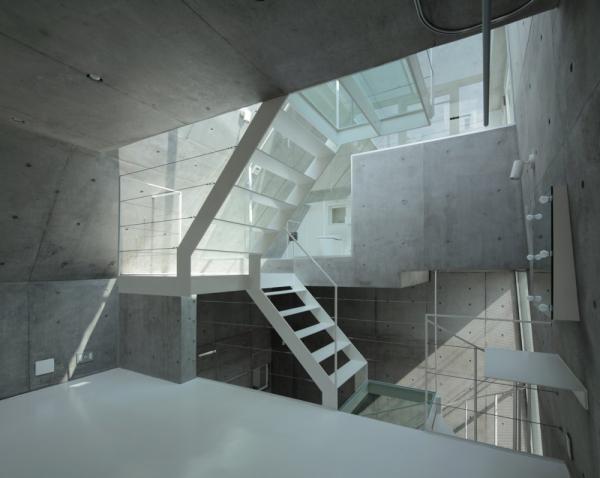Những tia nắng mặt trời rọi xuống, len lỏi qua trần nhà tráng men và phòng tắm, qua cầu thang treo và sàn nhà bằng kính, chiếu sáng cho không gian sống với thiết kế chìm.