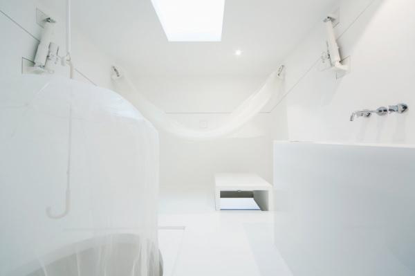 Công trình kiến trúc màu trắng khuất phía sau bụi cây có kích thước quá khiêm tốn đủ để có thể “chen” một chỗ trong các khu đô thị và cung cấp đầy đủ tiện nghi cho một người ở.