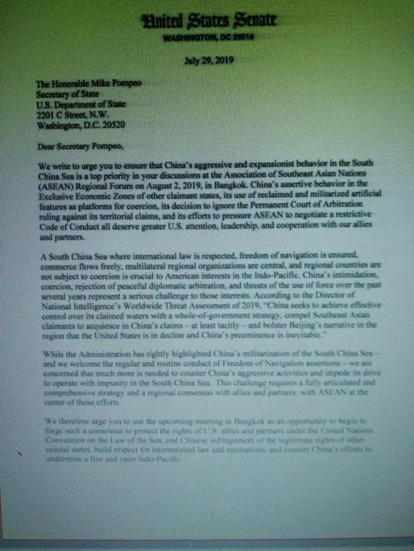 Bức thư với chữ ký của cả bốn Thượng nghị sỹ kêu gọi Ngoại trưởng Mike Pompeo đảm bảo những hành vi gây hấn và bành trướng của Trung Quốc ở Biển Đông là ưu tiên hàng đầu trong các cuộc thảo luận tại Diễn đàn Khu vực ASEAN (ARF) ngày 02 tháng 8 ở Bangkok, Thái Lan.