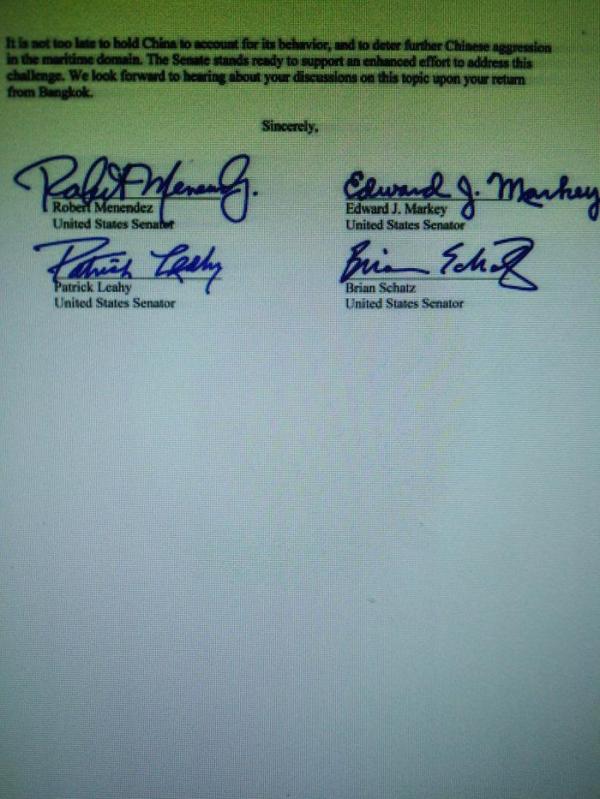 Bức thư nhấn mạnh, hành vi của Trung Quốc ở vùng đặc quyền kinh tế của các nước khác, cải tạo, quân sự hóa các thực thể nhân tạo làm cớ để ép buộc các nước, phớt lờ phán quyết của tò.a Trọng tài Thường trực và việc Trung Quốc gây áp lực buộc ASEAN nhượng bộ trong đàm phán Bộ Quy tắc Ứng xử (COC) đều đáng để Mỹ chú ý hơn, thể hiện vai trò lãnh đạo nhiều hơn, cũng như tăng cường hợp tác với các đồng minh và đối tác của Mỹ.