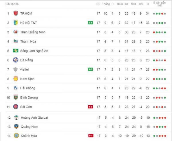 Sau vòng 17 V.League, vị trí các đội trên bảng xếp hạng có nhiều sự thay đổi đặc biệt ở nhóm cuối khi HAGL đá.n,h. bại SLNA với tỷ số 3-2 trên sân nhà.