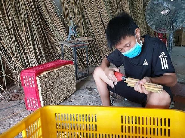 Công nhân đang tiến hành làm ống hút từ cây tre.