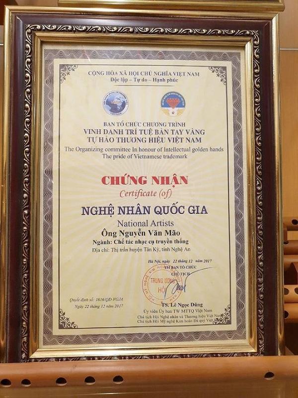 Năm 2017, Nguyễn Văn Mão được công nhận là Nghệ nhân quốc gia cho việc chế tác nhạc cụ dân tộc.