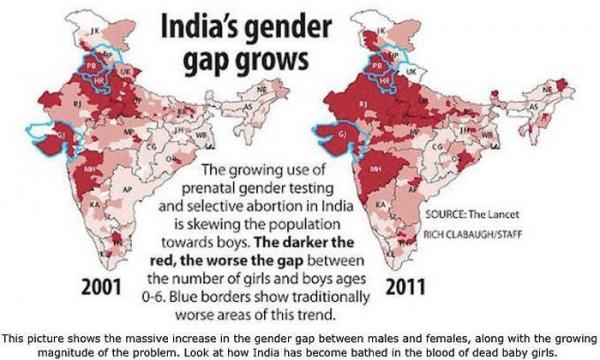Theo Báo cáo Khảo sát Quốc gia ấn Độ năm 2011, tỷ lệ nam/nữ ở trẻ em từ 0-6 tuổi ở ấn Độ từ năm 1971 đến 2011, đã thay đổi từ 1000/964 thành 1000/914. Trong 10 năm trước 2011, xu hướng này lan ra hơn 2/3 số bang ở ân Độ. Ngay cả ở các thành phố lớn, vấn đề cũng nghiêm trọng không kém. Năm 2011, tỷ lệ trẻ em trai/gái ở thủ đô New Delhi là 1000/871, là một trong những nơi thấp nhất trong cả nước. Theo báo cáo của Quỹ Dân số Liên hợp quốc (UNFPA), tại một số bang ở miền bắc ấn Độ, sự chênh lệch giới tính ở trẻ em lên tới 1.000 (nam)/ 850 (nữ).