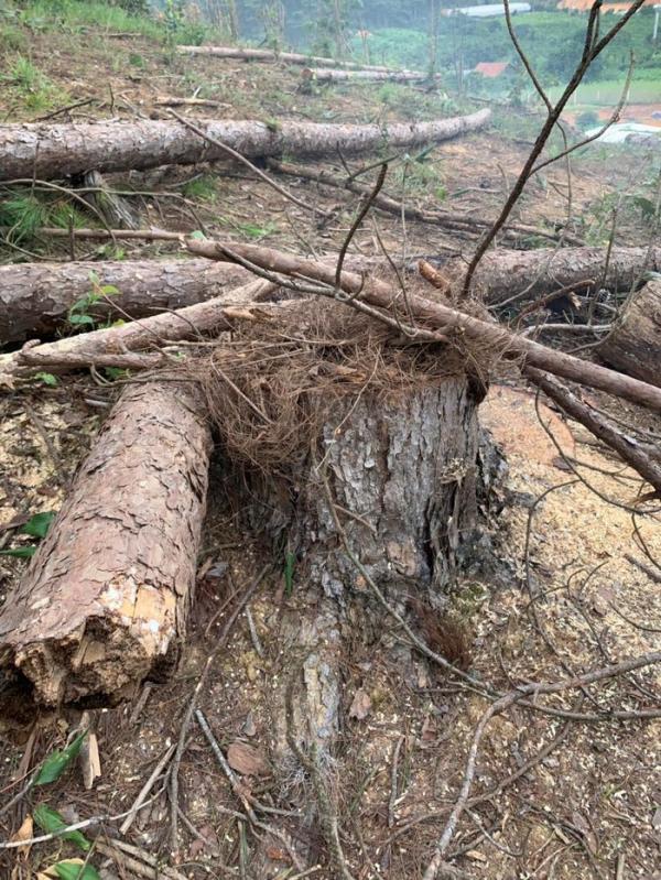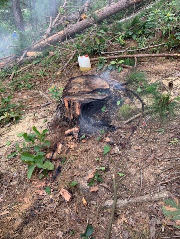 Ghi nhận của cơ quan chức năng tại hi.ện trư.ờng, có 23 cây thông bị cưa hạ, nhiều gốc thông bị đốt ch.áy để phi tang.