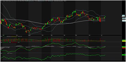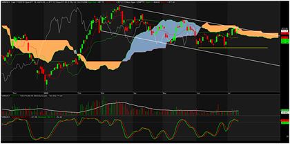 Với hệ thống Ichimoku, VN-Index đã tiến sâu vào vùng mây và chuẩn bị thoát ra, mặc dù đường Tenkan đã ở trên Kijun nhưng bộ đôi này vẫn đi ngang, chưa thấy đường Tenkan bứt hẳn lên bám sát giá. Về cơ bản, hệ thống này vẫn ủng hộ nhịp tăng tiếp diễn cũng như chưa đưa ra tín hiệu gì đáng phải lưu ý.