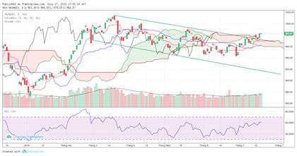 Với hệ thống Ichimoku, do giá biến động hẹp mà vị trí tương đối của cây nến ngày 17/7 với các chỉ báo của hệ thống rất ít thay đổi.
