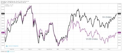 Nhưng hiện tại, VN30 đang gặp ngưỡng cản từ đường MA200 khá mạnh, suốt từ tháng 4 đến nay chỉ số VN30 chưa vượt được. Kể cả phiên 25/7, chỉ số VN30 cũng chưa thể vượt qua.