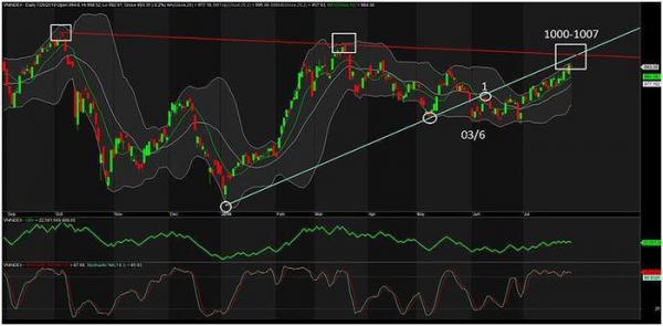 Trong phiên, đã có lúc chỉ số được đẩy lên tới 998,52 vượt luôn cả dải BB Top, nhưng không được bao lâu vì cầu giá cao không đủ mạnh để hỗ trợ chỉ số tiến thêm.