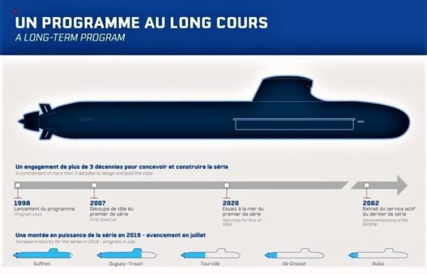 Ngày 12/7/2019, tại thành phố cảng Cherbourg đã diễn ra buổi hạ thủy tàu ngầm Suffren - sản phẩm có bước đột phá cao về cả công nghệ và chiến lược - với sự hiện diện của Tổng thống Pháp Macron, Bộ trưởng Quốc phòng Pháp Parly và người đồng cấp Australia Reynolds. Dù chưa tàu ngầm nào thuộc lớp Barracuda được đưa vào hoạt động nhưng Pháp đã thiết kế phiên bản cải biên Barracuda Block 1A sử dụng động cơ điện- diesel để xuất khẩu cho Hải quân Australia 12 chiếc với trị giá hợp đồng 50 tỉ AuD (50 tỉ đô la Australia).