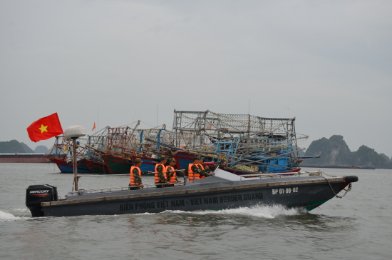 Cán bộ, chiến sĩ Hải đội 2, BĐBP Quảng Ninh kêu gọi ngư dân về nơi tránh trú bão an toàn. Ảnh: Quang Anh