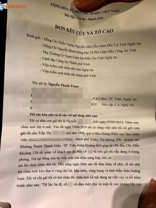 Ngày 1/8, trung tá Nguyễn Hữu Cường - Phó Trưởng Công an TP Vinh (Nghệ An) cho biết, hiện cơ quan công an đã nhận được đơn tố cáo của anh Nguyễn Thành Trung (trú phường Lê Mao) về việc con gái anh Trung mới 6 tuổi bị nhóm người xâm h.ại t.ìn,h d,ục tại khách sạn.