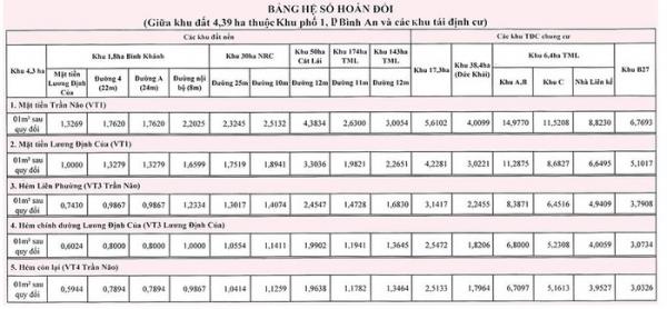 Sau đó, tổ công tác mới đưa ra cách tính đền bù theo quy chiếu hệ số. Tức là đơn vị tư vấn vẫn tính giá thị trường không kiểm soát để làm cơ sở quy chiếu hệ số tỷ lệ diện tích đất được hoán đổi. Ví dụ 1 m2 ở đường Trần Não theo giá thị trường không kiểm soát sẽ được bao nhiêu mét vuông nếu hoán đổi sang đường Lương Định Của cũng theo giá thị trường không kiểm soát. Cùng với thuê tư vấn, tổ công tác cũng lấy đơn giá nhà nước ban hành gần đây nhất liên quan đến những vị trí được đổi đất để tính hệ số quy đổi. Kết quả cho ra gần tương đồng với con số mà đơn vị tư vấn đã tính. Bước cuối cùng, đơn vị tư vấn thẩm định và thống nhất với hệ số quy đổi mà tổ công tác đưa ra phù hợp với chính sách đền bù.