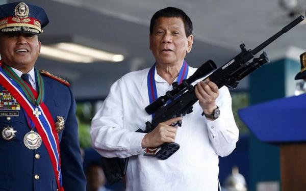 Tổng thống Philippines Duterte cầm một khẩu s.ú.n,g trường Galil do Israel chế tạo. Ảnh: AP.