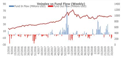 Dòng vốn qua các quỹ ETF ngoại cũng tương tự. Sau 7 tháng liên tục hút ròng thì dòng tiền qua các quỹ ETF đang có dấu hiệu bị rút ra kể từ đầu tháng 8 cho tới nay. Trong tháng 2 và tháng 3, các quỹ ETF đã thu hút thêm được 93,65 triệu USD và 78,82 triệu USD, qua đó đưa chỉ số VN-Index đạt đỉnh 1.014 điểm giữa tháng 3.