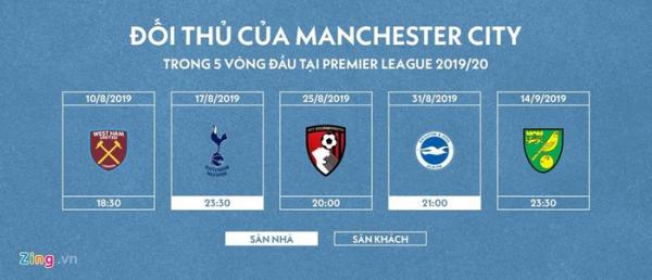 Lịch thi đấu chặng khởi đầu cũng tạo cho Man City đòn bẩy để sớm bứt tốc. Trong 10 vòng đầu, Man City chỉ phải gặp duy nhất Tottenham là đối thủ lớn. Như vậy, nếu giữ phong độ đàn áp trước những đội bóng nhỏ như mùa trước, Man xanh hoàn toàn có quyền hy vọng giành trọn vẹn 30 điểm trong 10 trận đầu. Việc có bước chạy đà hoàn hảo là yếu tố vô cùng quan trọng trong cuộc đua đến ngai vàng Premier League.