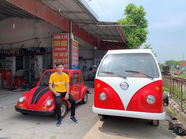 Chiếc xe điện chạy bằng năng lượng mặt trời kiểu dáng Volkswagen Roadtrip (bên phải) do Việt Cường mới lắp ráp. (Ảnh: Việt Linh)