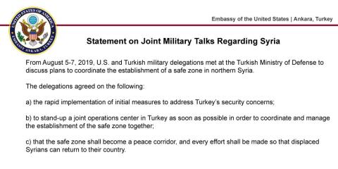 Hôm 7 tháng 8, Bộ Quốc phòng Thổ Nhĩ Kỳ và Đại sứ quán Hoa Kỳ tại Thổ Nhĩ Kỳ đã công bố một tuyên bố chung tuyên bố kế hoạch hợp tác trong việc thành lập một khu vực an toàn ở miền bắc Syria.
