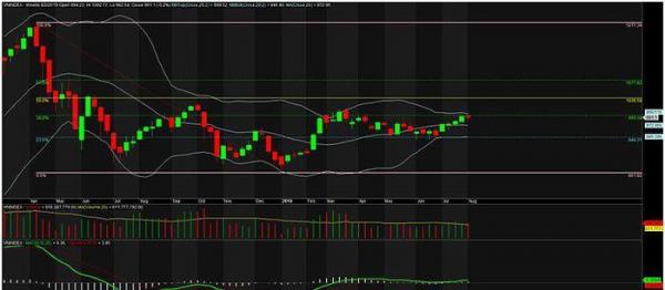 Ở khung thời gian này, dải BB đang thắt lại, giá trong tuần có test BB top, nhưng thất bại. Ngoài ra, cần nhắc lại là VN-Index vẫn đang d,a.o động trong khoảng fibo 23,6% (944,31) và fibo 38,2% (995,34). Hiện tại, chỉ số vẫn chưa thoát ra khỏi vùng d,a.o động này (944,31 - 995,34). Ngưỡng cản 995,34 rất mạnh khi đã rất nhiều lần VN-Index cố gắng vượt qua nhưng đều thất bại.