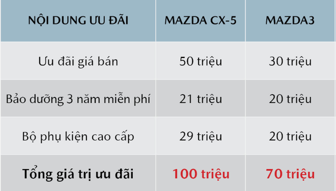 Cụ thể, Mazda CX-5 được giảm trực tiếp 50 triệu tiền mặt, miễn phí 21 triệu đồng phí bảo dưỡng 3 năm và phụ kiện 29 triệu, đưa mức ưu đãi cho mẫu xe này cao nhất trong các dòng Mazda. Hiện, giá phiên bản Deluxe về còn 859 triệu đồng. Giá lăn bánh tạm tính tại Hà Nội và TP HCM là 991 triệu đồng và 954 triệu đồng.