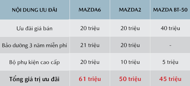 Và trong tháng 8 này, khách hàng mua xe Mazda sẽ nhận được gói ưu đãi cao nhất lên đến 100 triệu đồng, bao gồm: Ưu đãi trực tiếp giá bán, tặng bộ phụ kiện cao cấp, cùng gói bảo dưỡng miễn phí 3 năm hoặc 50.000 km.