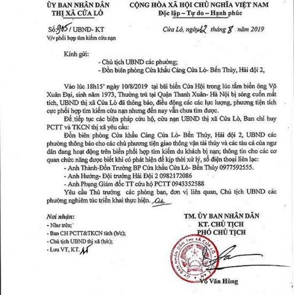 Theo PV, ngày 12/8, UBND thị xã Cửa Lò, tỉnh Nghệ An có công văn số 904/UBND-KT gửi UBND tỉnh Nghệ An, Thường trực Ban chỉ huy Phòng chống thiên tai và Tìm kiếm cứu nạn tỉnh Nghệ An đề nghị hỗ trợ lực lượng, phương tiện và kêu gọi các huyện ven biển, Ban Chỉ huy Phòng chống thiên tai và Tìm kiếm cứu nạn tỉnh Hà Tĩnh hỗ trợ tìm kiếm du khách bị nạn trên biển.