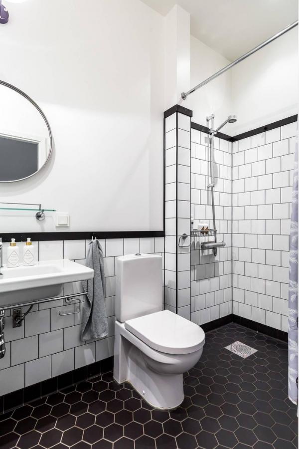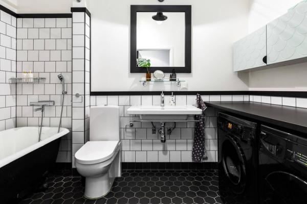 Phòng tắm nổi bật với hai gam màu đen - trắng.