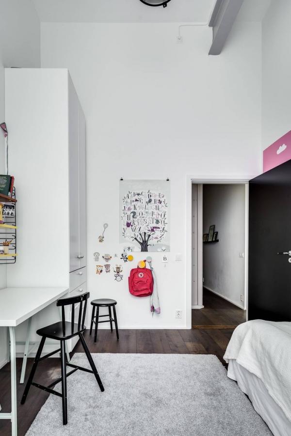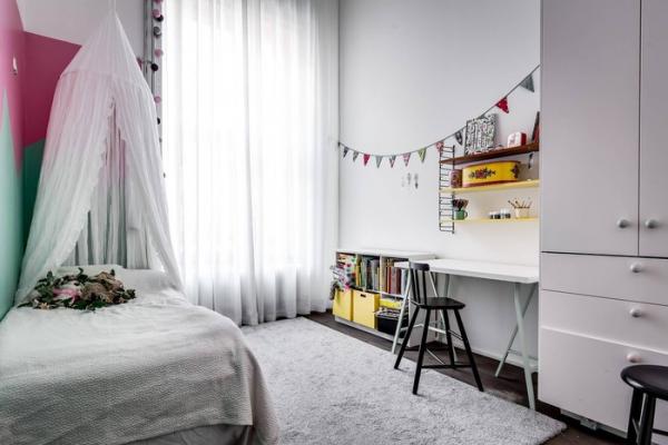 Phòng ngủ thứ hai được bố trí khác biệt với phong cách nữ tính, nhẹ nhàng. Bức tường kết hợp sơn hai màu xanh – hồng làm màu nhấn. Bên cạnh đó là thảm trải sàn màu ghi, bàn làm việc được chọn theo kiểu dáng Bắc Âu. Căn phòng có thêm hệ tủ sá.t góc tường giúp bé có thêm không gian lưu trữ cần thiết.