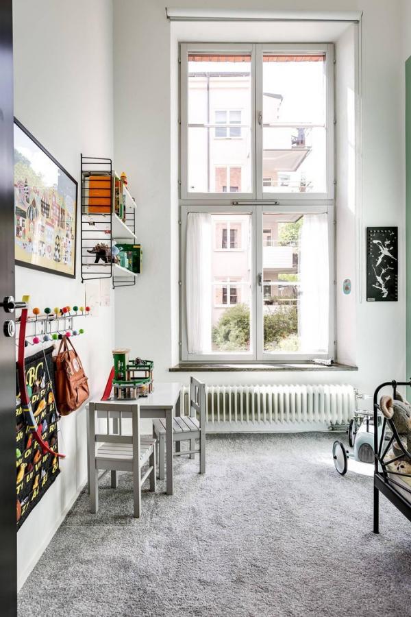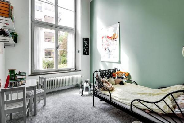 Phòng ngủ của bé được chọn màu xanh lá tạo điểm nhấn sinh động. Những mảng màu ghi của nội thất, một phần tường hay thảm trải sàn vừa giúp cân bằng bảng màu vừa giúp chiếc giường kim loại của bé trở nên nổi bật.