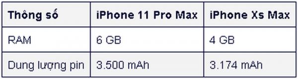 Cuối cùng là iPhone 11 Pro Max được trang bị pin khá lớn khi so sánh với iPhone Xs Max, với các con số tương ứng lần lượt là 3.500 mAh và 3.174 mAh. Nhờ vậy pin trên iPhone 11 Pro Max kéo dài hơn đến 5 giờ so với iPhone Xs Max. Bên cạnh đó, iPhone 11 Pro Max cũng có RAM 6 GB như người anh em iPhone 11 Pro.