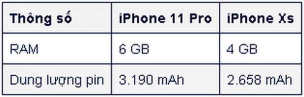 Tiếp theo là iPhone 11 Pro, mẫu smartphone kế nhiệm iPhone Xs, có pin lớn hơn đáng kể so với phiên bản tiền nhiệm. Đó là lý do vì sao Apple cho biết pin iPhone 11 Pro có thời lượng kéo dài hơn 4 giờ so với Xs. Còn đối với RAM, iPhone 11 Pro có 6 GB, cao hơn so với iPhone 11 Xs chỉ có RAM 4 GB. Điều này cho thấy Apple ít nhất đã bắ.t kịp một số đối thủ Android về khả năng này.