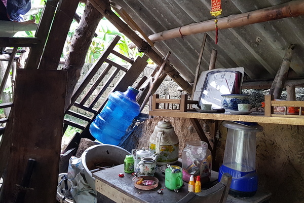 Ông Đức hiện đang sống trong túp lều lá được dựng đơn sơ tạm bợ bằng vách đất trơ trọi giữa cánh đồng ở xã Mai Lâm. Mưa xuống, đồ đạc trong túp lều ướt sũng, ông lại phải đi đến nhà anh em ở nhờ.