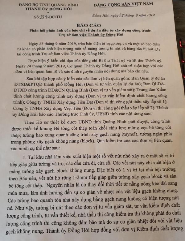 Ngay trong ngày 25/9, ông Hoàng Văn Tâm, Phó Bí thư thường trực Thành ủy Đồng Hới, đã có báo cáo ngày số 284-BC/TU gửi Thường trực Tỉnh ủy, UBND tỉnh, các sở ban ngành liên quan. Theo văn bản báo cáo này, trụ sở làm việc của Thành ủy bị nứt là do xây gạch blog, thời tiết thay đổi từ nắng nóng kéo dài sang mùa mưa làm ảnh hưởng đến co dãn về nhiệt của vật liệu gạch không nung.
