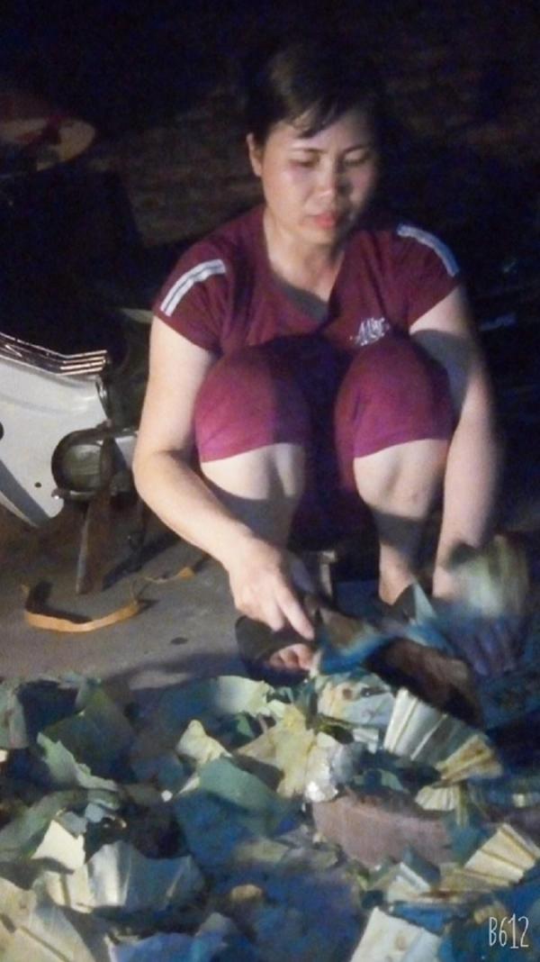 Buổi tối cô Xuân tranh thủ băm lá sen kiếm thêm thu nhập (Ảnh: V.N)