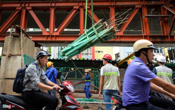 Hàng ngày, vật liệu xây dựng liên tục được cần cẩu vận chuyển lên ngay trên đầu người tham gia giao thông, tiềm ẩn nguy cơ ta.i nạ.n.