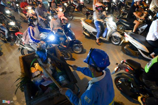 Ông Minh (49 tuổi), công nhân môi trường quận Đống Đa, cho biết đường Trường Chinh thường xuyên ùn tắc giờ cao điểm nên xe thu gom rác không vào được. Công việc bị kéo dài đến 22h, khi đường vãn, ông mới quét lại và chuyển rác lên xe.