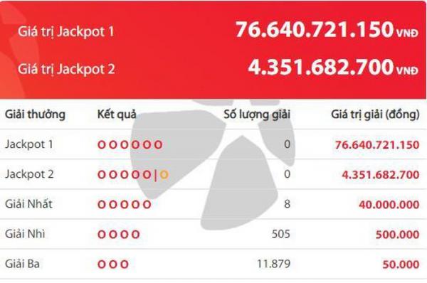 Xem xét trên hệ thống với số vé bán ra trước đó, Vietlott đã không tìm được người may mắn trúng giải Jackpot 1 trị giá 76.640.721.150 đồng. Giải Jackpot 2 với giá trị 4.351.682.700 đồng cũng không tìm thấy chủ nhân.