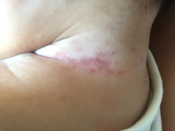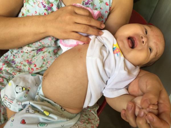 Trên cơ thể của bé Thư là chi chít những vết thâm đen vì tiêm thuốc, lấy ven, vết xuất huyết. Bụng của bé bắt đầu phù to hơn bình thường.